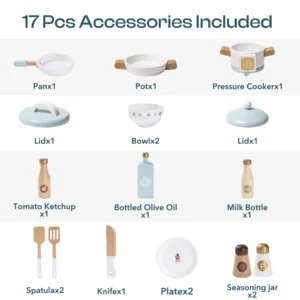 🍳 ROHKED TARVIKUD: Komplekt sisaldab mitmekesist valikut tarvikuid, sealhulgas realistlikke maitseainepudeleid, potte, kausse, köögiriistu, armsat teeserviisi ning pehmet lappi. Tarvikud rikastavad laste mängukogemust ning äratavad huvi toiduvalmistamise ja koduste tegevuste vastu. 🍴